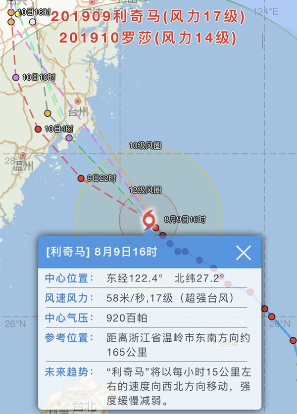 201989日下午16時實(shí)時臺風(fēng)路徑。紅色預(yù)警,直撲浙江。