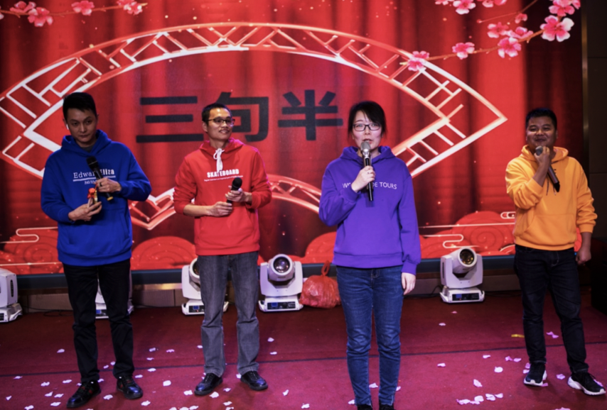 首先登場(chǎng)的就是我們美麗帥氣,青春洋溢的主持人。從左到右依次為烽火辦事處朱作成、大客戶部雷康悅、市場(chǎng)發(fā)展部王莉萍及金華辦事處張業(yè)成。